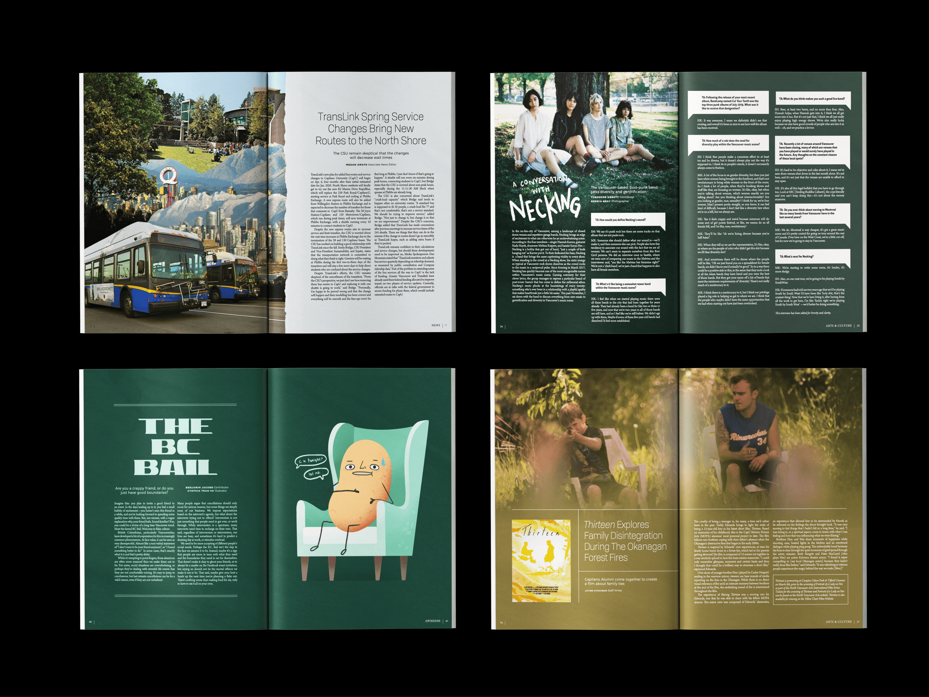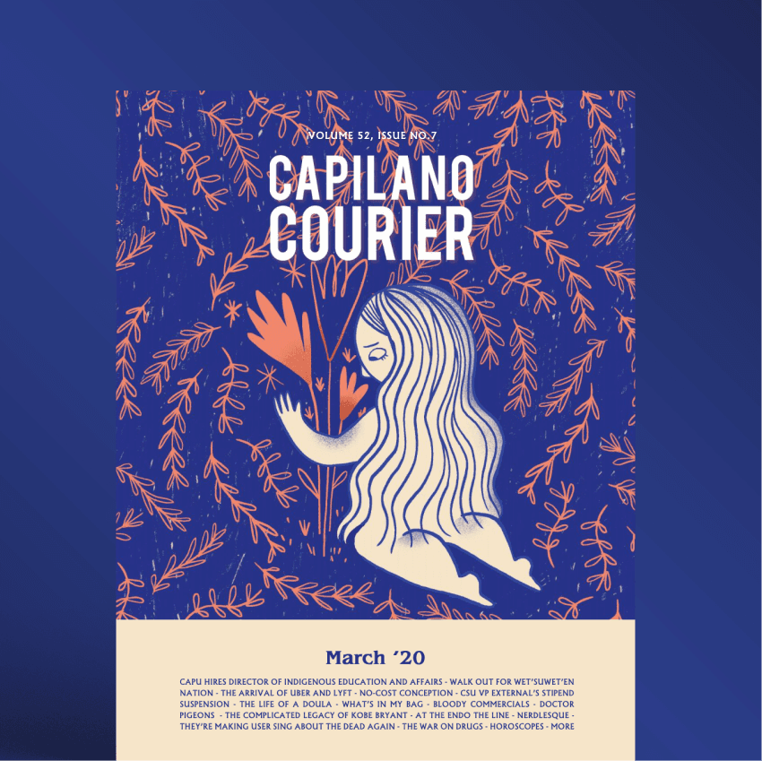 I served as Art Director for the Capilano Courier, designing biweekly layouts and working closely with editors across arts & culture, opinions, news, and columns. I managed illustrator sourcing, handled full-magazine design, and led a complete rebrand in my second year, shifting the Courier from tabloid newsprint to a modern magazine. In total, I had the chance to work with 80+ emerging artists.