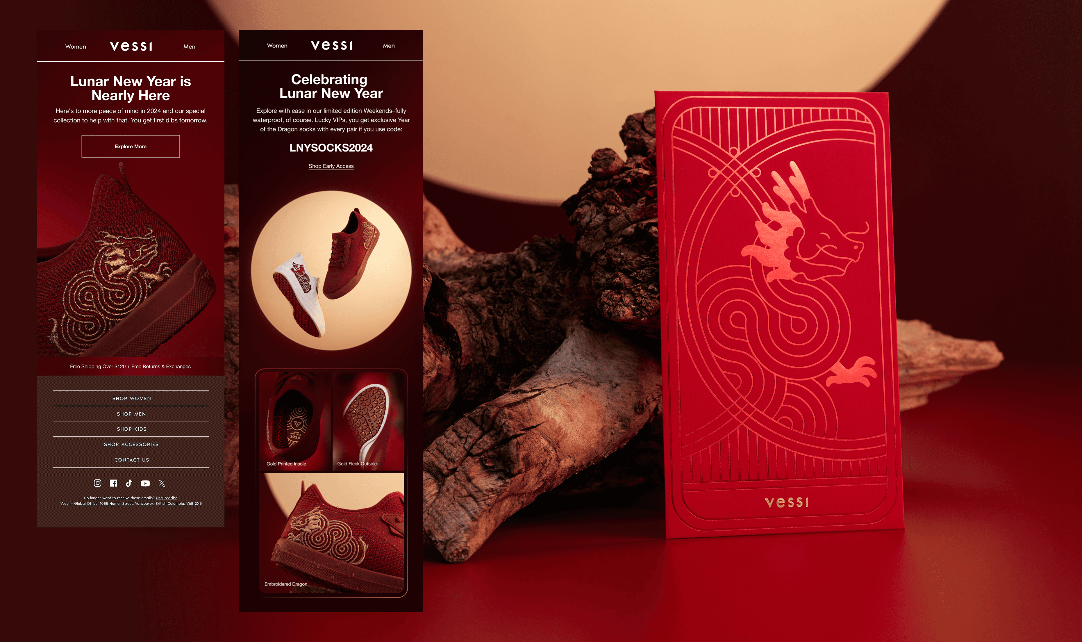 I worked on two Lunar New Year drops at Vessi, Year of the Dragon and Year of the Snake. I worked closely with the product team to shape all the on-product graphics, from the main shoe artwork down to the insole and pull tab details. I also handled the marketing visuals and supporting collateral for the celebratory launch.