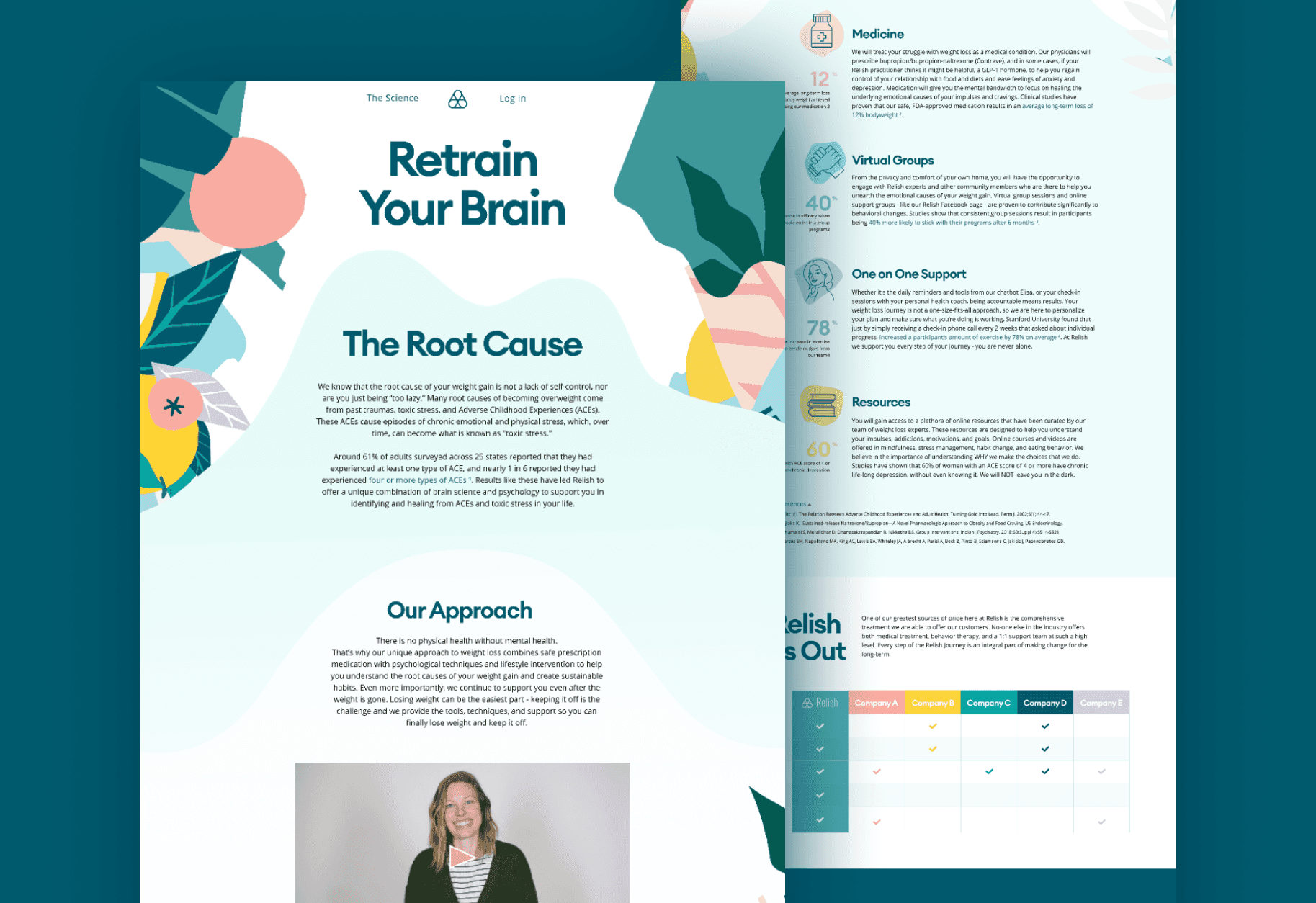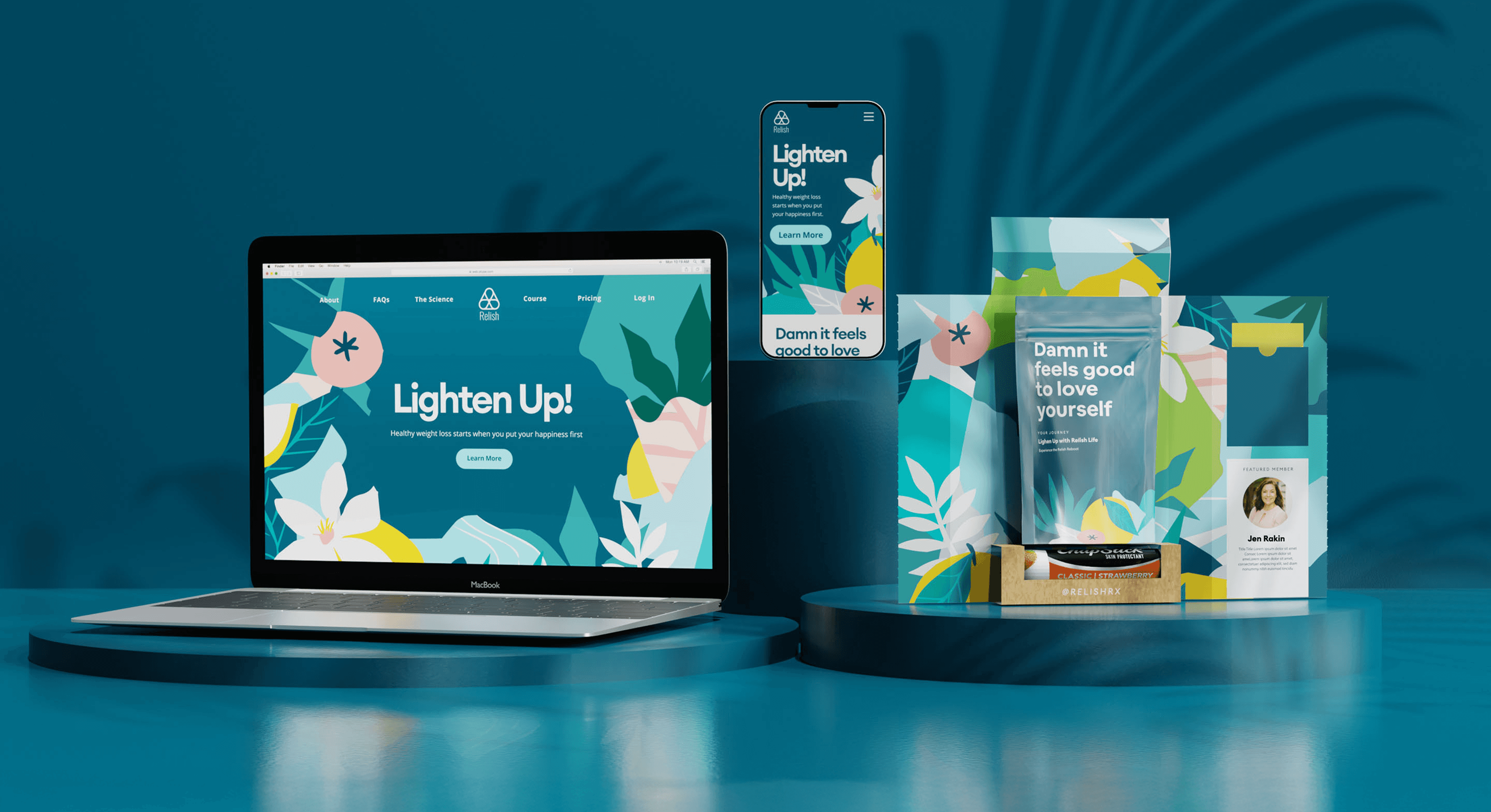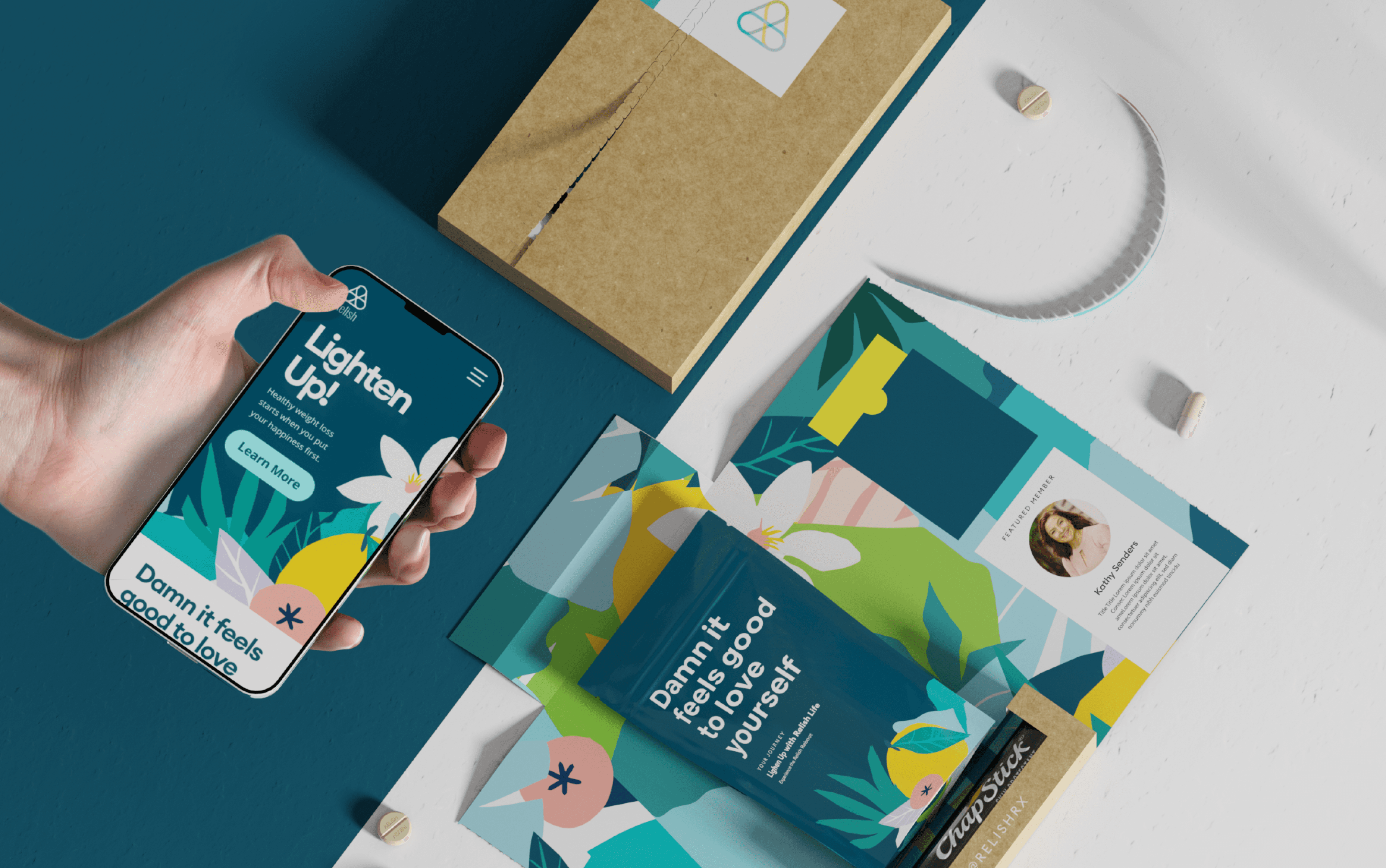 For Relish RX, we designed a sustainable monthly subscription kit for their holistic–medical weight loss program. Minimal on the outside, bright and fun on the inside, with recyclable components, an inspirational pouch, and flexible sections for member spotlights and seasonal add-ons.