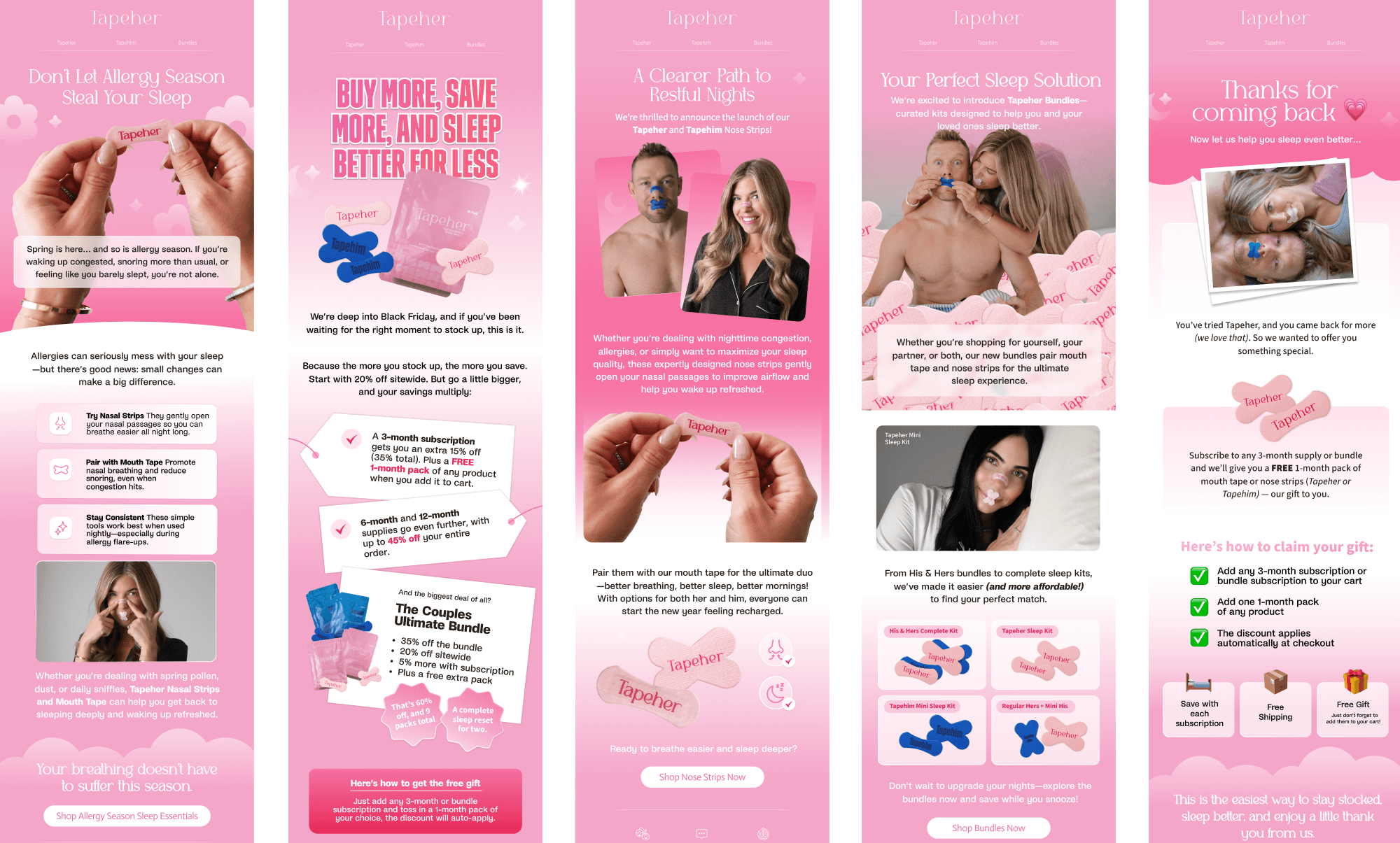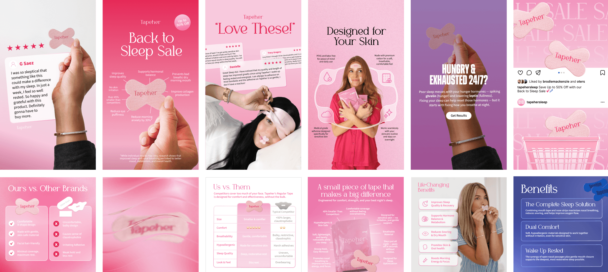 Tapeher is a female-founded mouth tape brand on a mission to make better sleep feel simple. I work closely with the marketing team to create email flows, paid ads (shaped by ROAS performance and fast-moving trends), web visuals, packaging, and promotional moments.