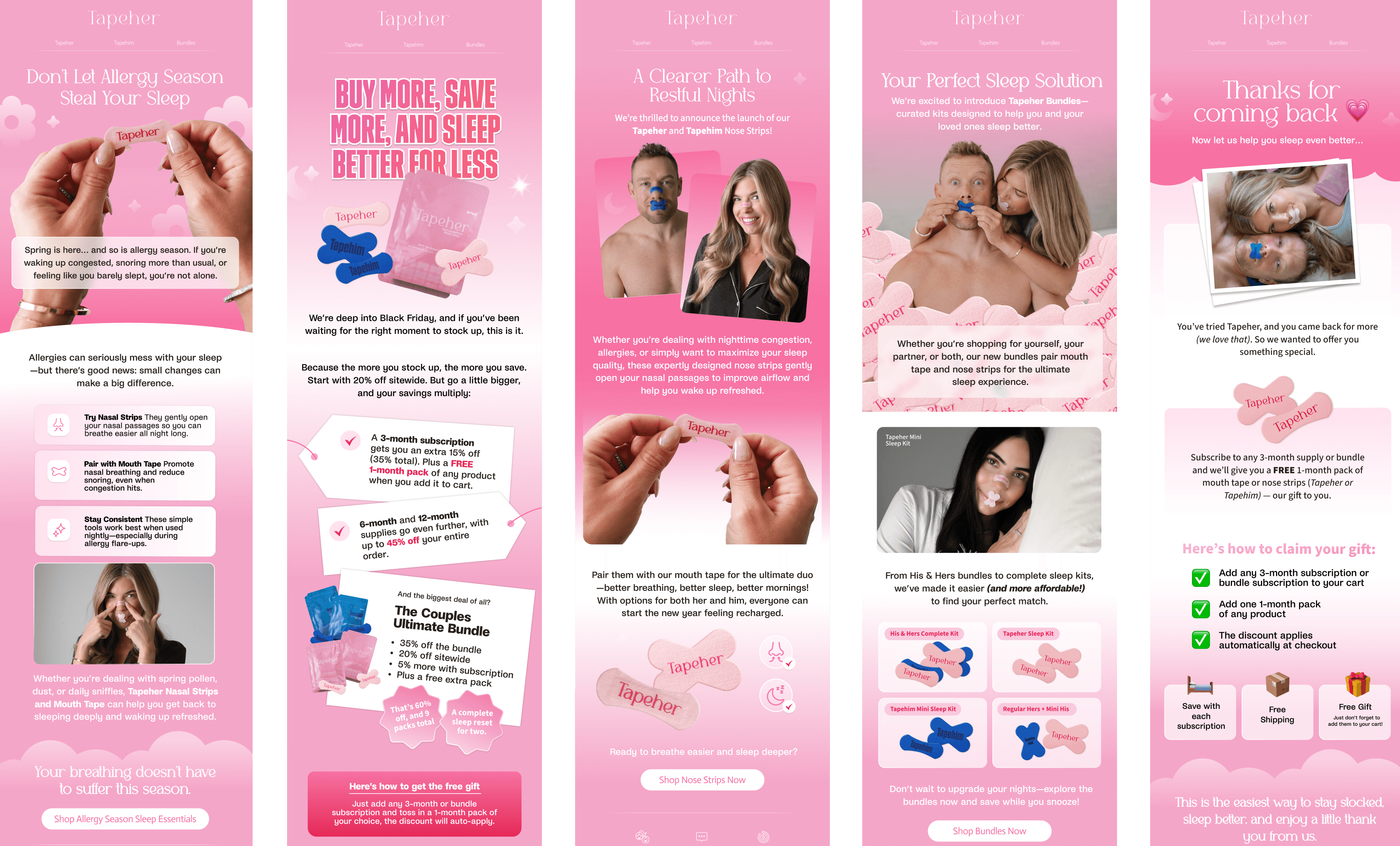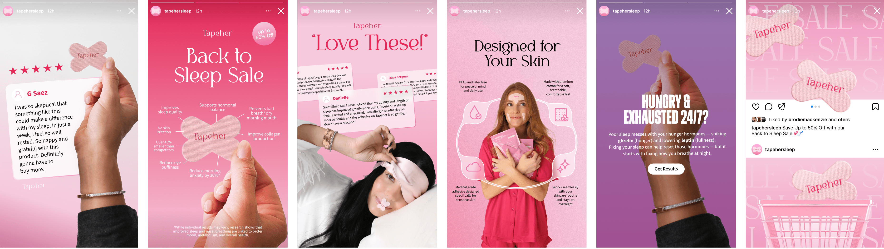 Tapeher is a female-founded sleep brand focused on making good rest feel easy. I work with the founders on the full mix of creative of ROAS-friendly ads, email flows, web visuals and packaging.